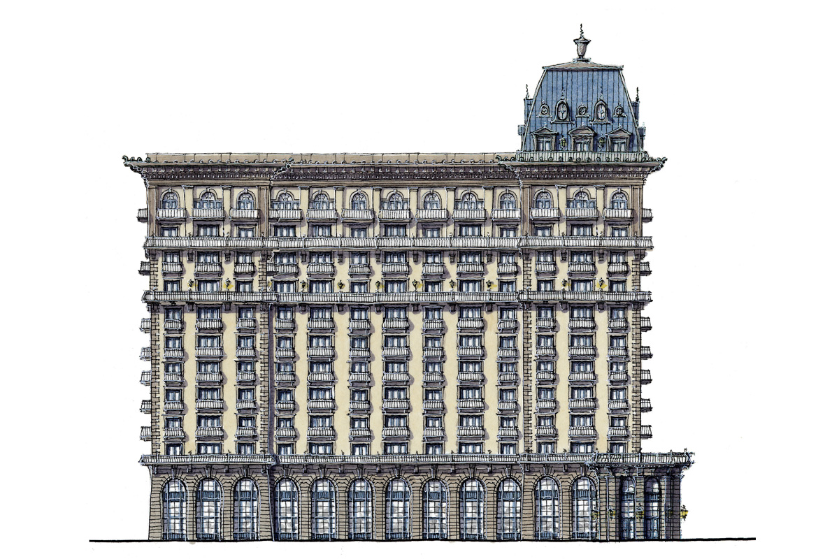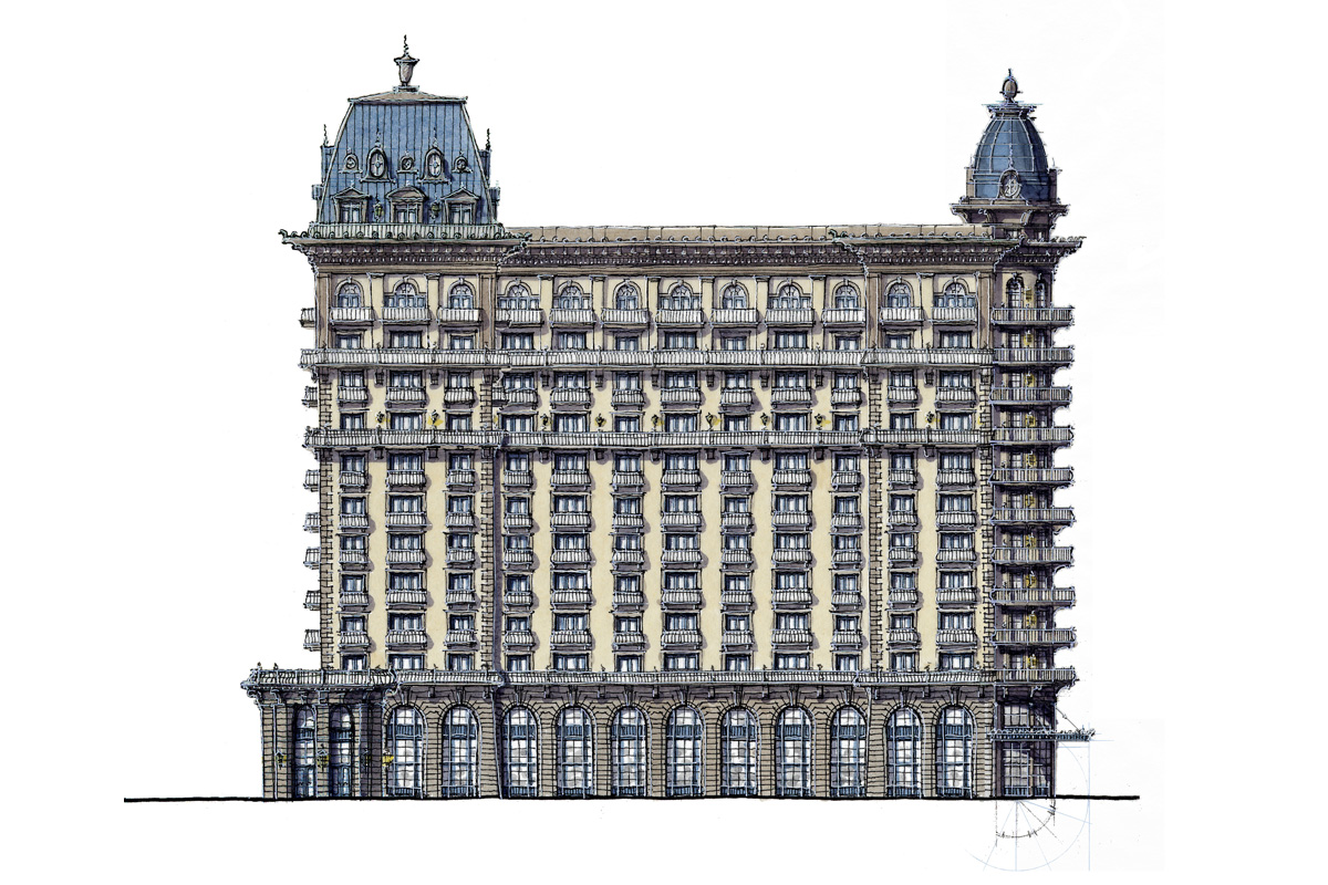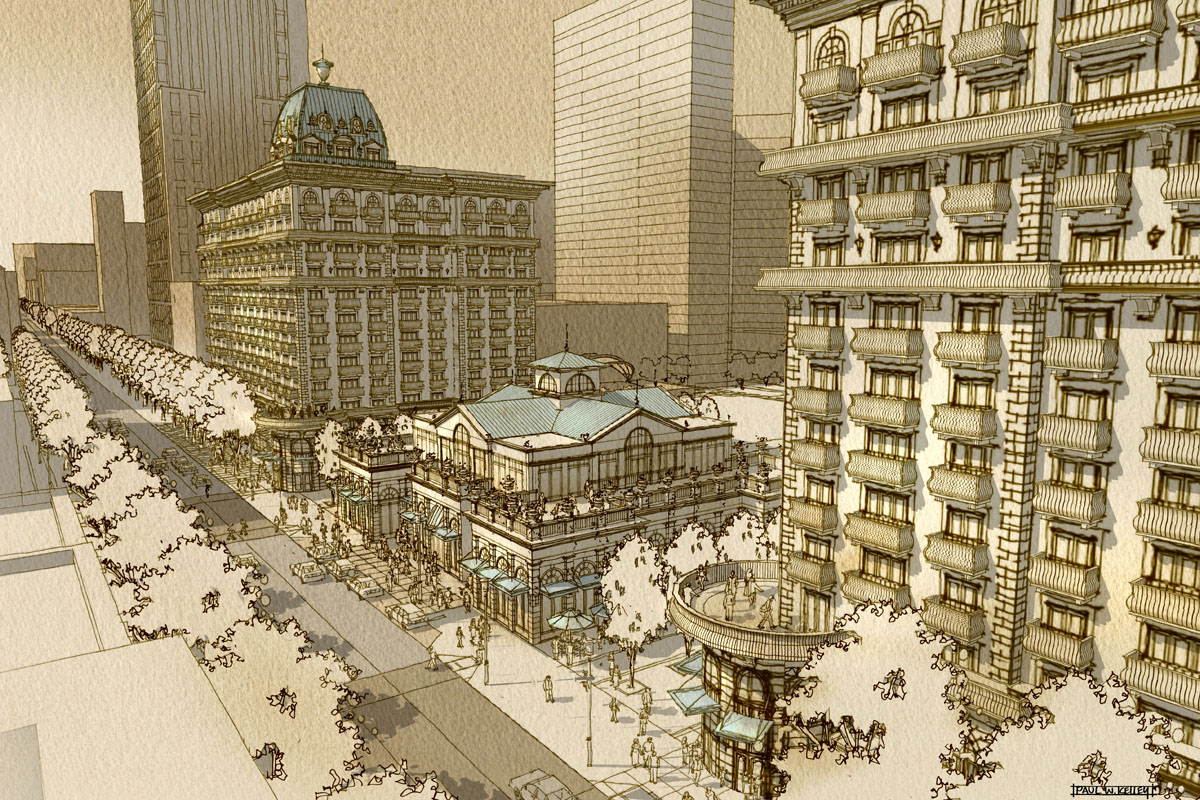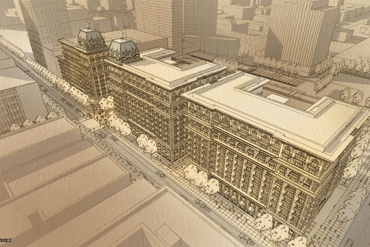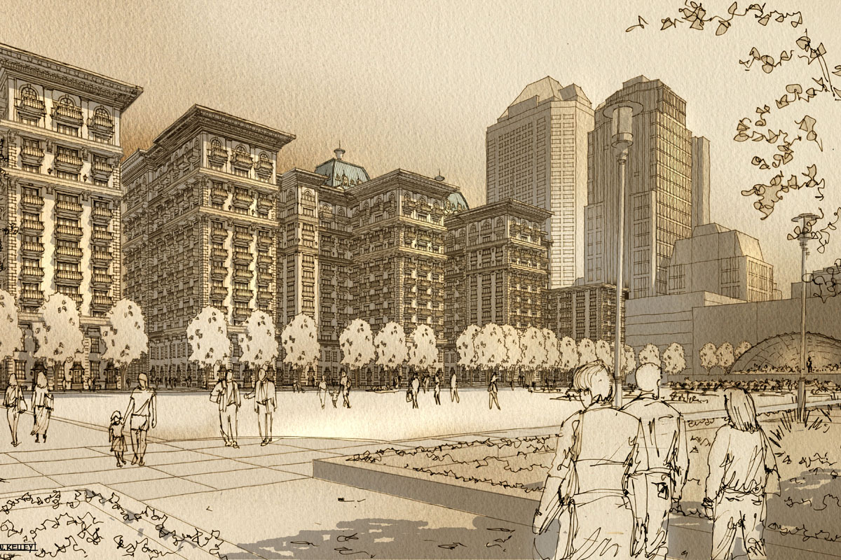 A series of high rises designed to provide downtown Columbus with its own unique neighborhood, complete with tree-lined paths, offices, and retail shops. Shown are a few different preliminary design schemes investigating the use of the old City Center Shopping Center site.