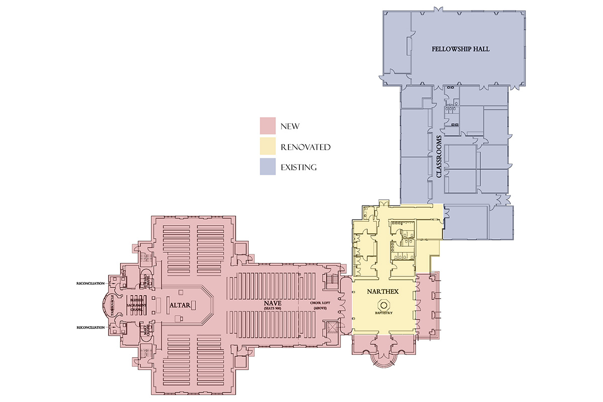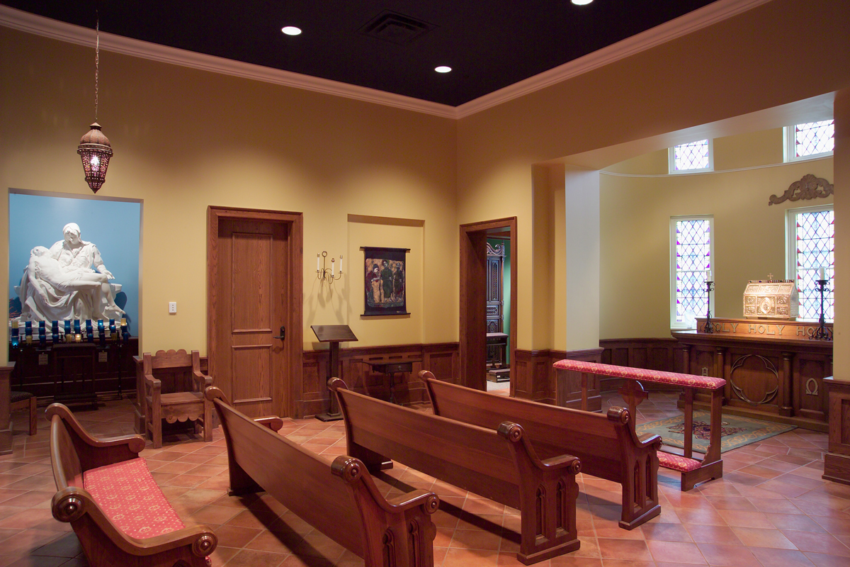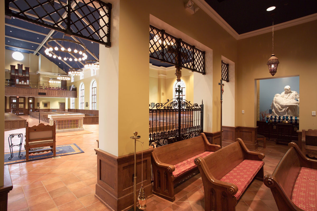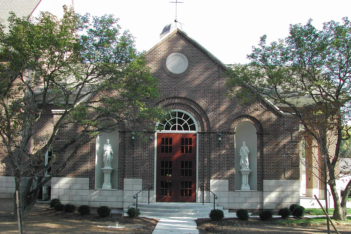 David B. Meleca was chosen by St. Edward the Confessor Catholic Church in Granville, Ohio to design a new church seeking to expand to 900 seats. Meleca designed a new 14,500 sf cruciform worship space and renovated the existing church as the Narthex of the new complex. The new Narthex is accessed from the east via a Classical entrance portico. The wood ceiling and timbers of the original church are still visible in the Narthex which includes a baptismal font under a cupola. The interior includes original murals painted by a local artist, a choir loft with pipe organ, side chapels and a perpetual adoration chapel. The exterior features brick arches and quoins, limestone caps and a rusticated limestone base.